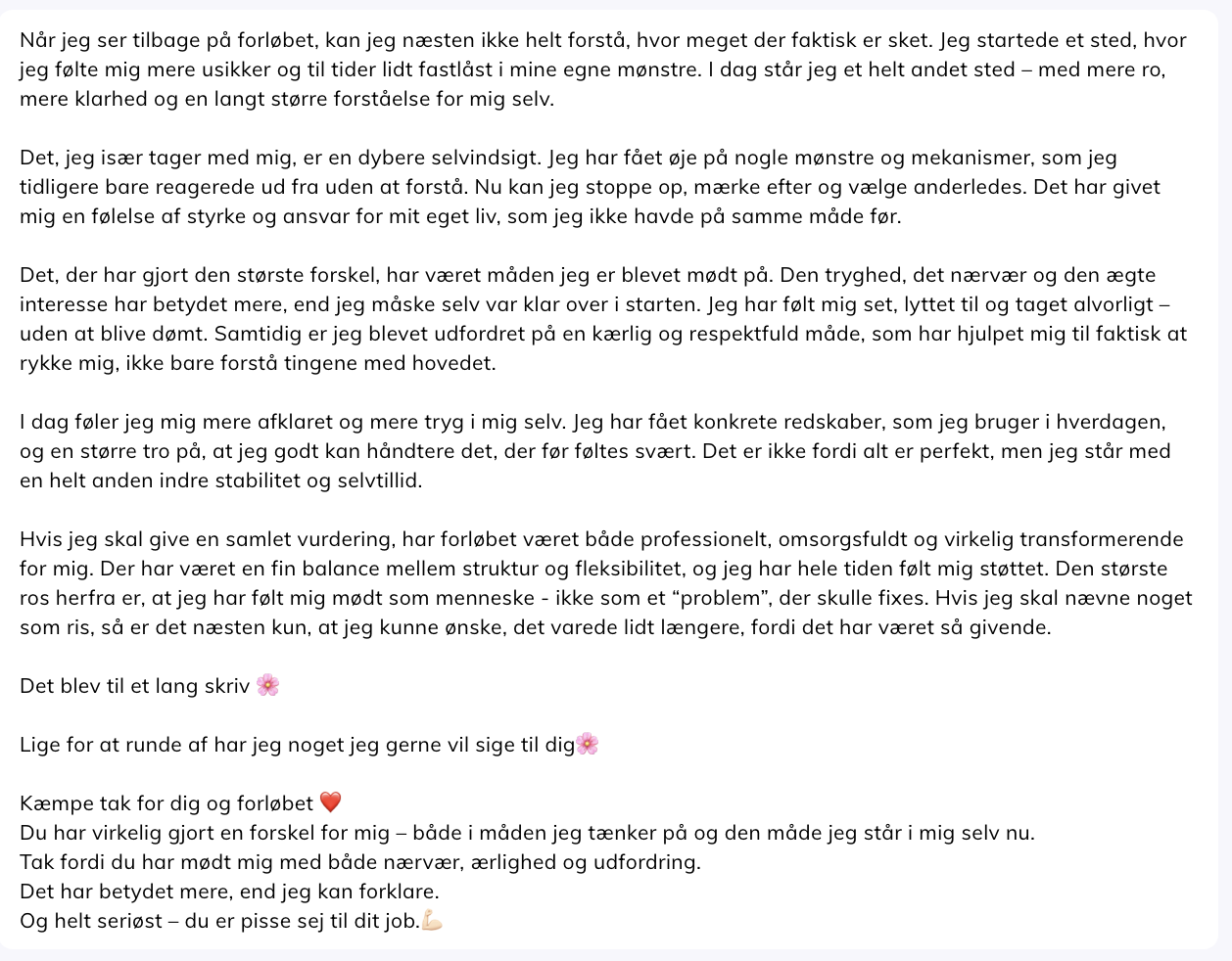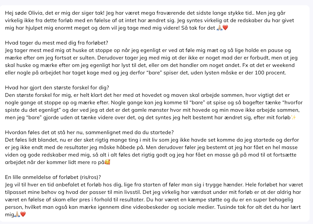 Til dig, der ønsker at arbejde i dybden - med dig selv, dine mønstre og din relation til mad og krop. Her starter vi indefra. Med tanker, vaner, identitet og den måde, du taler til dig selv på.
