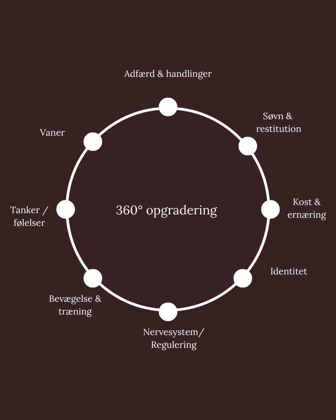 En strategisk 360°-tilgang, hvor vi arbejder med identitet, adfærd, nervesystem, kost og bevægelse - så forandringen forankres indefra og holder på den lange bane.