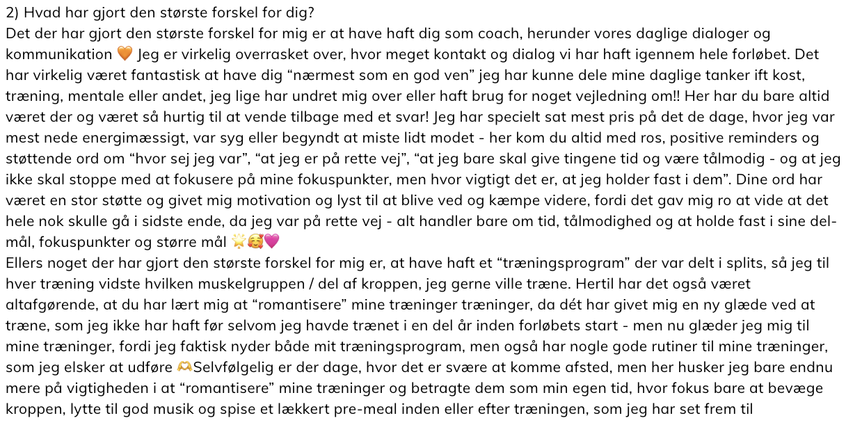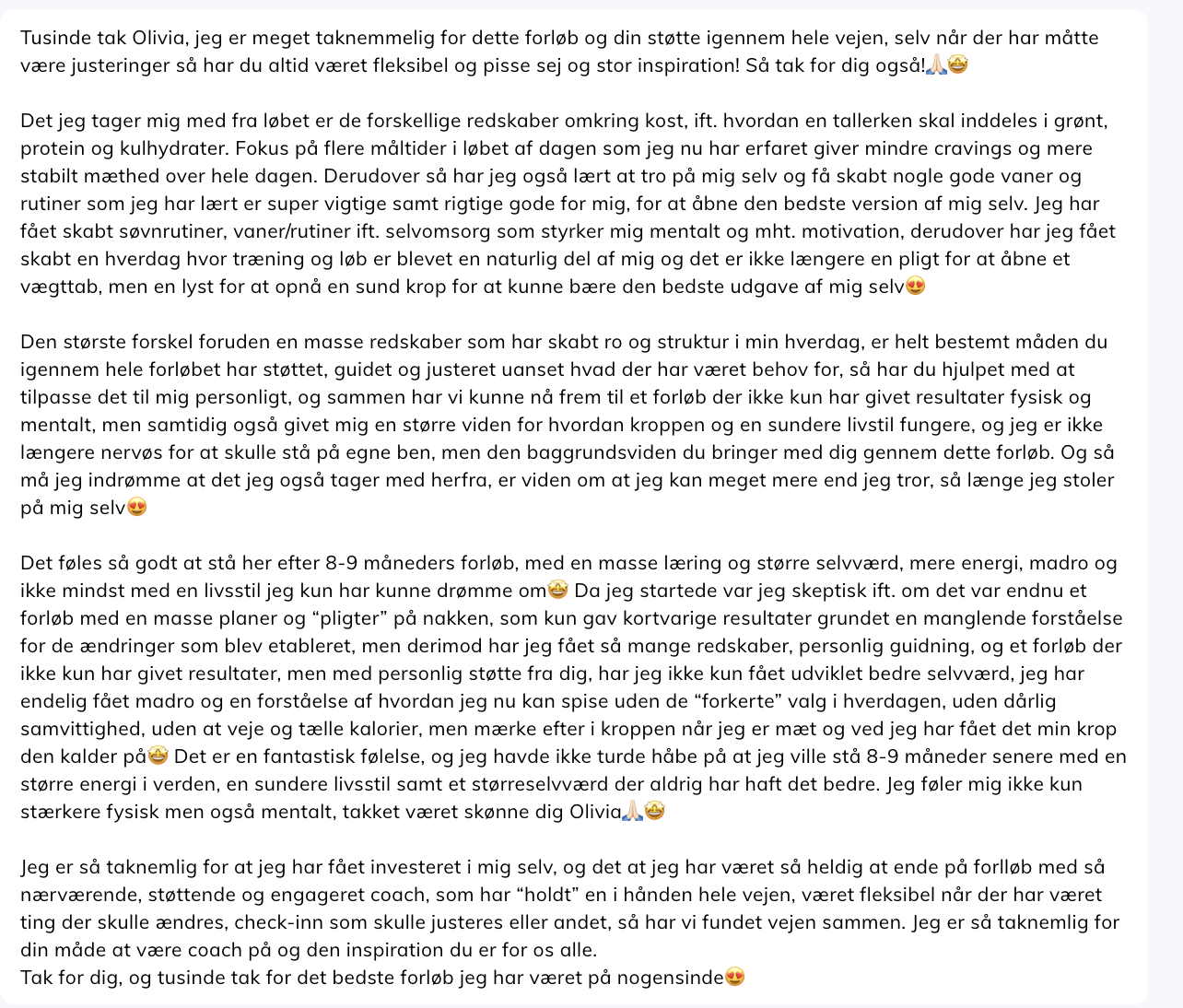 Jeg tror på, at sundhed skal føles naturlig. Ikke som kontrol og dårlig samvittighed, men som ro, styrke og balance. Et sted hvor maden giver energi og frihed. Hvor bevægelse handler om selvtillid og glæde. Og hvor selvomsorg ikke er en luksus - men en nødvendighed <3